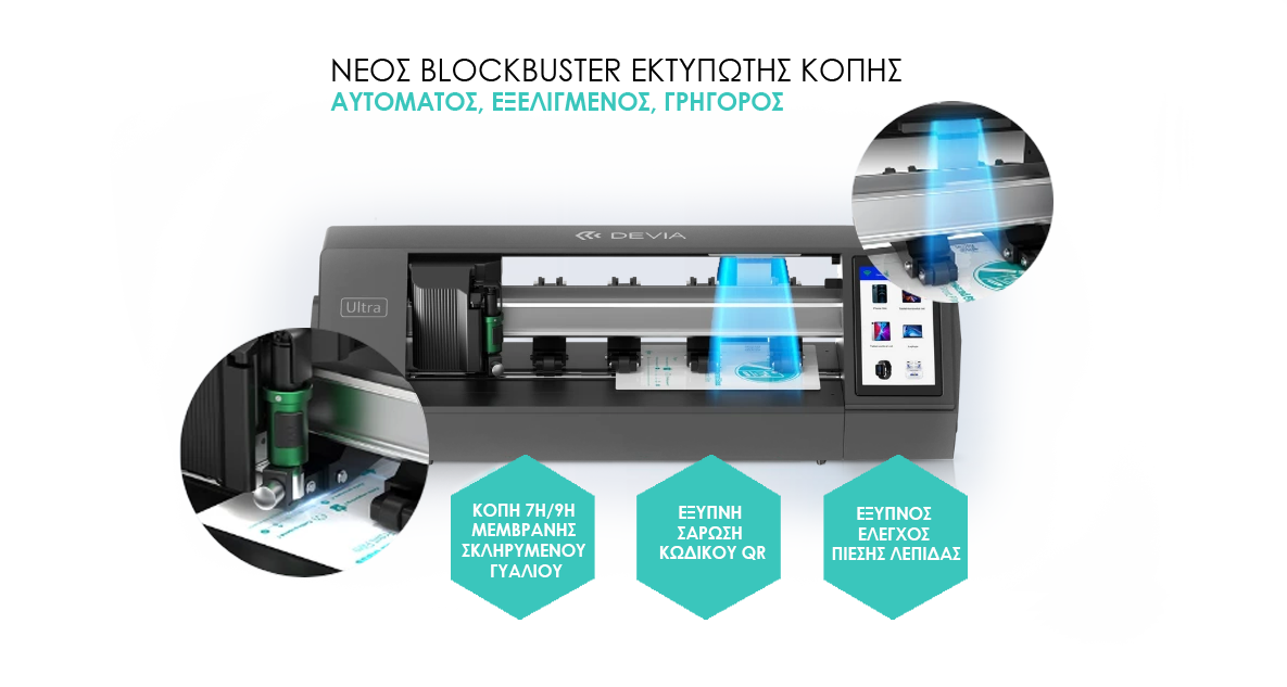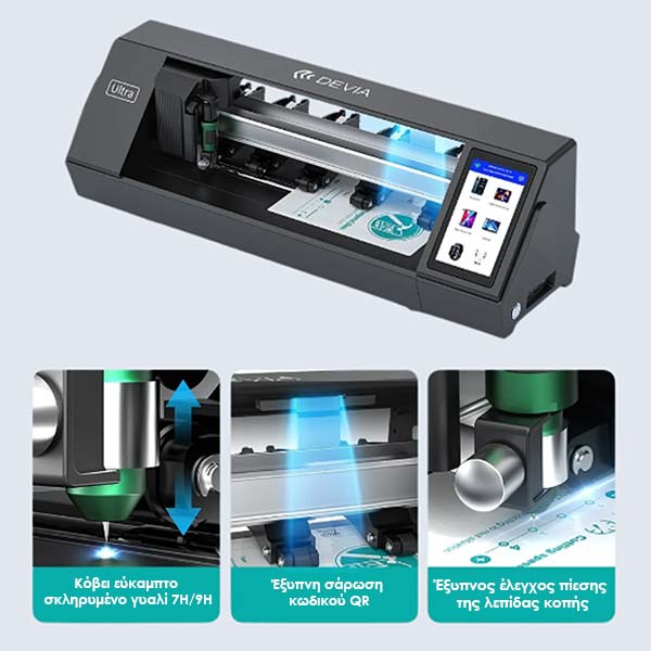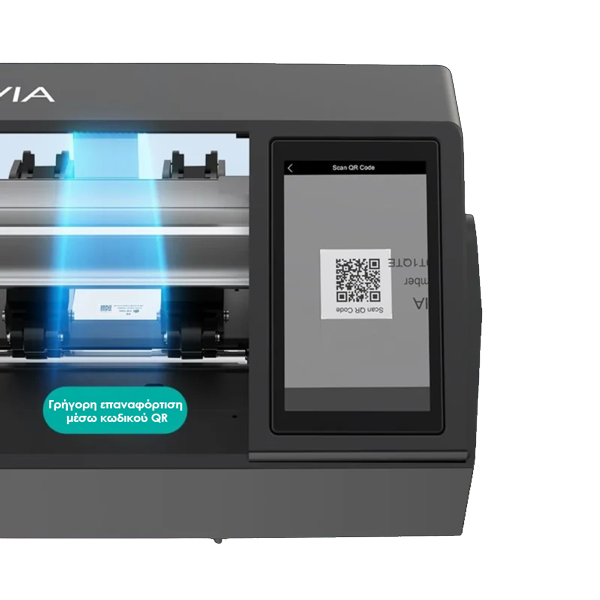 Χάρη στην έξυπνη Smart Camera της Devia, το σύστημα αναγνωρίζει τον κωδικό QR και προσαρμόζει αυτόματα και άμεσα την πίεση της λεπίδας κοπής, ανάλογα με το πάχος και τον τύπο του φιλμ, προσφέροντας απόλυτη ακρίβεια, ταχύτητα και ευκολία στη χρήση.