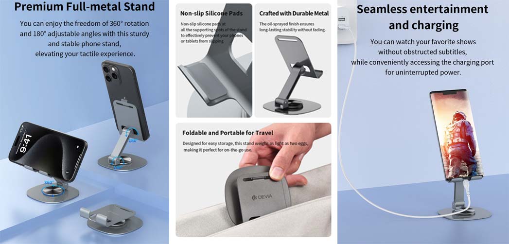 Αναβάθμισε το workspace σου με τη βάση laptop και tablet DEVIA 360° Rotation Stand. Δημιούργησε εργονομικό περιβάλλον εργασίας με σταθερή στήριξη και απόλυτη ευελιξία. Ρύθμισε εύκολα τη γωνία θέασης χάρη στον πλήρη μηχανισμό περιστροφής 360 μοιρών. Απόλαυσε άνετη χρήση για εργασία, τηλεδιασκέψεις, streaming και δημιουργία περιεχομένου.