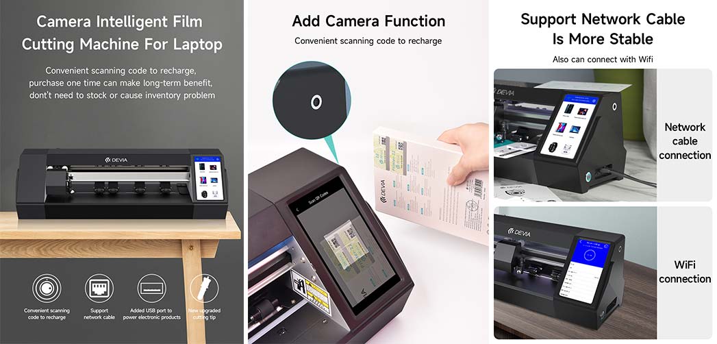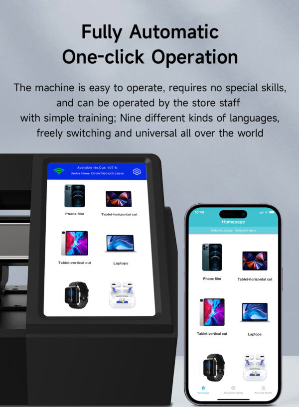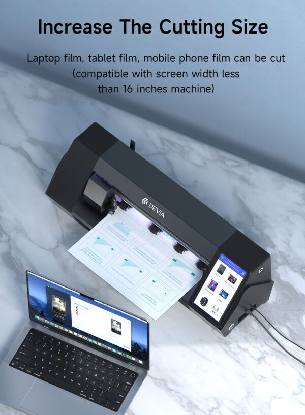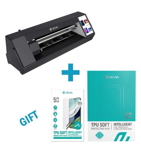 Εκτυπωτής Κοπής προστασίας υδρογέλης. Εκτυπωτής που κόβει μέχρι 16″ (40.6cm) μεμβράνη. Με οθόνη αφής και προεγκατεστημένη την εφαρμογή της Devia. Διαθέτει πλάγια κάμερα για να σκανάρει και να καταχωρεί τα qr codes από τις υδρογέλες. Μπορεί να κόψει προστασία οθόνης για smartphones, tablets, smartwatches, οθόνες digital cameras, smart tags, ηλεκτικά πατίνια, οθόνες αυτοκινήτων, λάπτοπ όπως και απλά να δώσεις τις διαστάσεις που θες εσύ και όλα αυτά μέσω της εφαρμογής Devia όπου θα βρείτε πάνω από 20000 μοντέλα και όλα τα τελευταία μοντέλα μεγάλων εταιρειών πριν καν κυκλοφορήσουν επίσημα στην αγορά. Έχει ενσωματωμένο USB port για φόρτιση συσκευών και τελικώς η λεπίδα του είναι από τιτάνιο για κοψίματα ακριβείας.