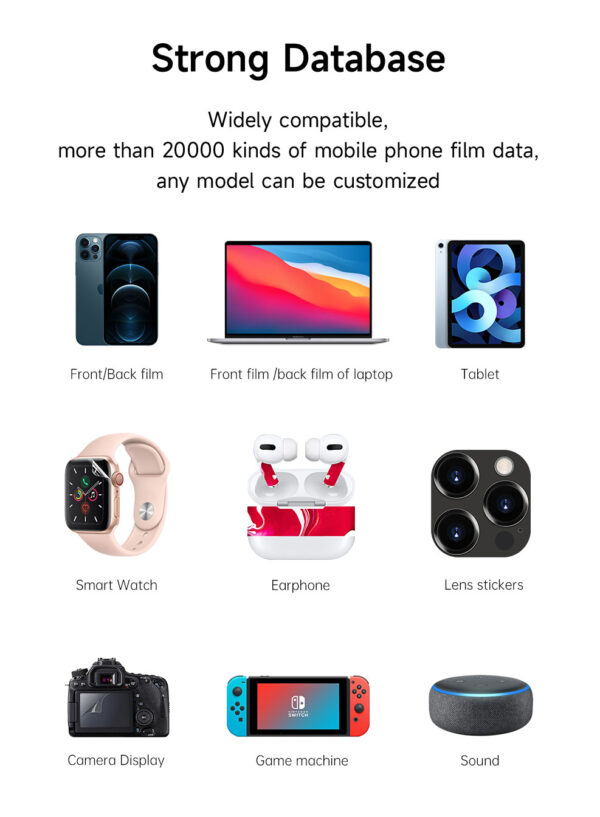 Με επαγγελματική ακρίβεια και ταχύτητα. Διαθέτει λεπίδα τιτανίου υψηλής ακρίβειας, οθόνη αφής, ενσωματωμένη εφαρμογή για άμεση επιλογή μοντέλων. Κάμερα QR scan για αυτόματη καταχώρηση κοψιμάτων. Αυτόματη τοποθέτηση του film προστασίας με τον νέο αισθητήρα της Devia. Υποστηρίζει πάνω από 20.000 συσκευές όπως smartphones, tablets, laptops, smartwatches και οθόνες αυτοκινήτου, με χρόνο κοπής μόλις 30 δευτερόλεπτα ανά φιλμ. Ιδανικό για καταστήματα κινητής τηλεφωνίας, service points και επαγγελματίες λιανικής που θέλουν γρήγορη παραγωγή προστατευτικών υψηλής ποιότητας.