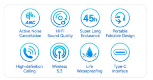 - Λειτουργίες: Κλήσεις, ακρόαση μουσικής, Ενεργή Ακύρωση Θορύβου (ANC), αναπαραγωγή AUX και αναδιπλούμενος σχεδιασμός.