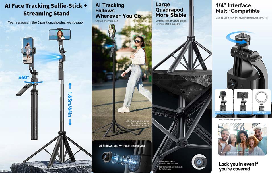 Το selfie stick μετατρέπεται εύκολα σε τρίποδο για streaming ή βίντεο κλήσεις. Το AI tracking σε κρατά στο κάδρο ακόμα και σε κίνηση. Το εργονομικό design προσφέρει άνετο κράτημα και ευκολία χρήσης. Δημιούργησε επαγγελματικό περιεχόμενο οπουδήποτε βρίσκεσαι. Επίλεξε ένα all-in-one αξεσουάρ για smartphone φωτογραφία και βιντεοσκόπηση.
